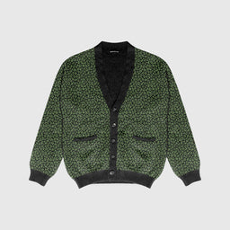 SSENSE Exclusive two color knit Italian mohair cardigan. Birdseye jacquard knit. Hand carved horn buttons. Featuring (2) front patch pockets. Stitched cuffs & finish.