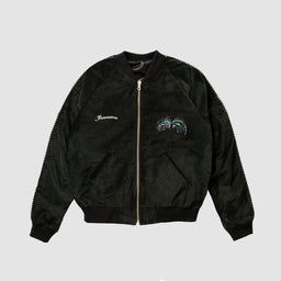 Reversible “crushed” Japanese cotton bomber jacket. Features embroidered graphics at chest and back. Reversible Riri zipper. Ribbed cuffs, collar, and waist. Features two (2) front pockets. Tonal reverse side made form 100% Japanese Satin.