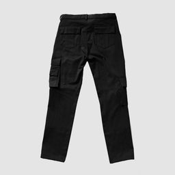 Straight leg cargo pocket featuring 13 pockets. Double entry at hip. Tack button waistband with cast d-ring. Riri hardware including hidden zip pocket behind left cargo pocket. Silk twill lined. Adjustable elastic cord and lock system at ankle.