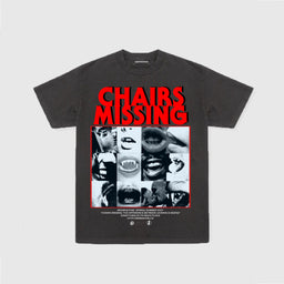 Short sleeve, boxy, loose fit tee. Cut and sewn from washed Japanese cotton. Features oversized "Chairs Missing" Front graphic in puff ink with glow in the dark halftone print. Oversized back print in puff ink. Ribbed neckline and tonal stitching.